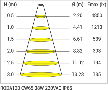 | RODA120 EVO | WW-NW-CW | 220-240V AC | 36 | 3.967 | 1224 | 1,3 |